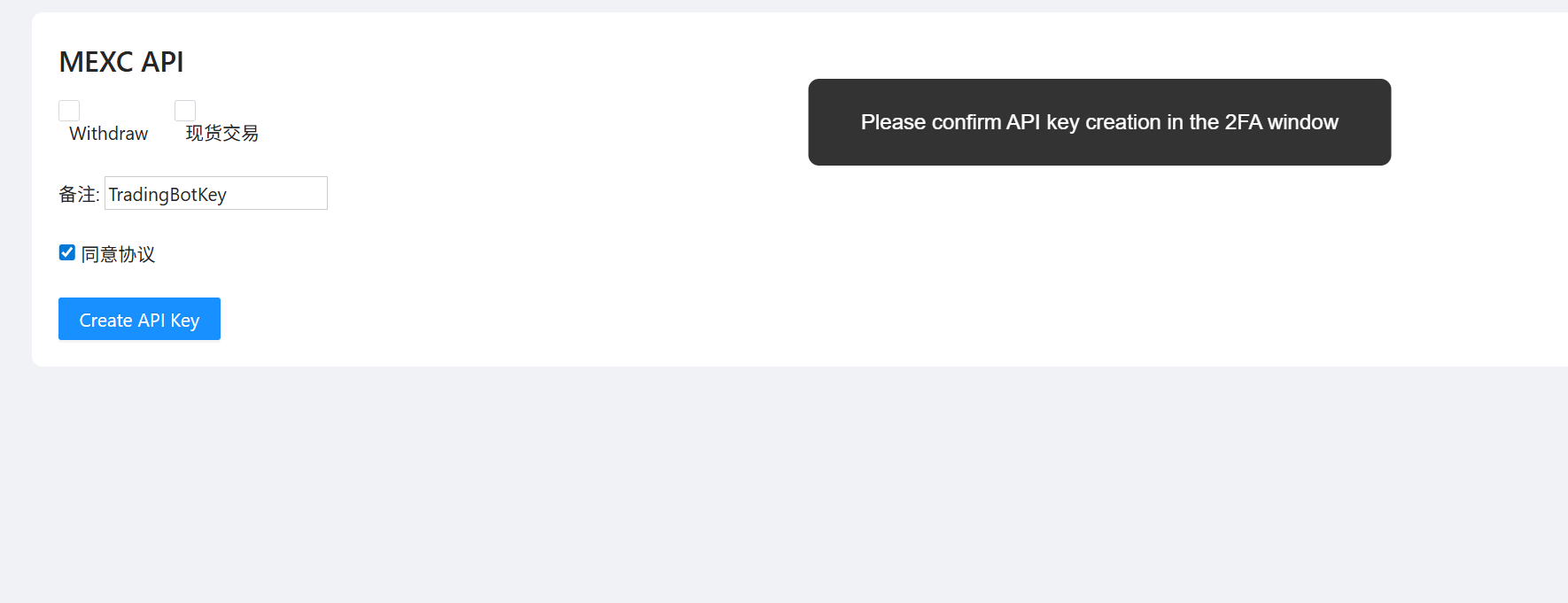 触发在用户完成2FA验证,网页弹出Success模态框,且脚本成功从DOM中抓取到API Key和 Secret Key之后立即调用的。