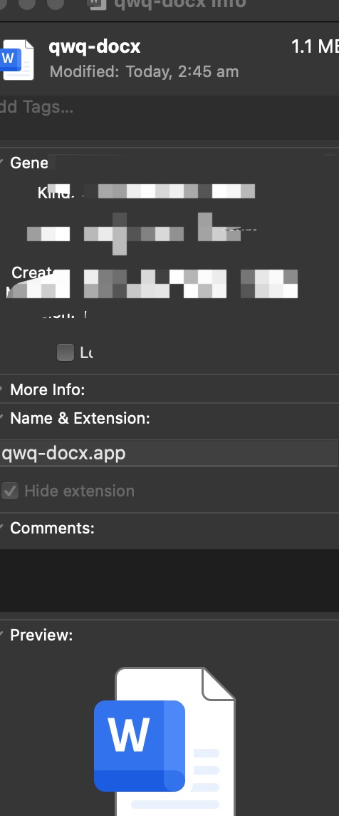 切到桌面,把它的图标换成Microsoft Word的图标,随便找一个真的.docx,点Get Info里面的Word图标复制,再打开之前的脚本文件粘贴。但是在这次复现中发现macOS的现代版本已经引入了针对双后缀欺骗的Mitigations。试了从右向左覆盖字符和其他几个办法都不太行,所以最后.app换成了-……